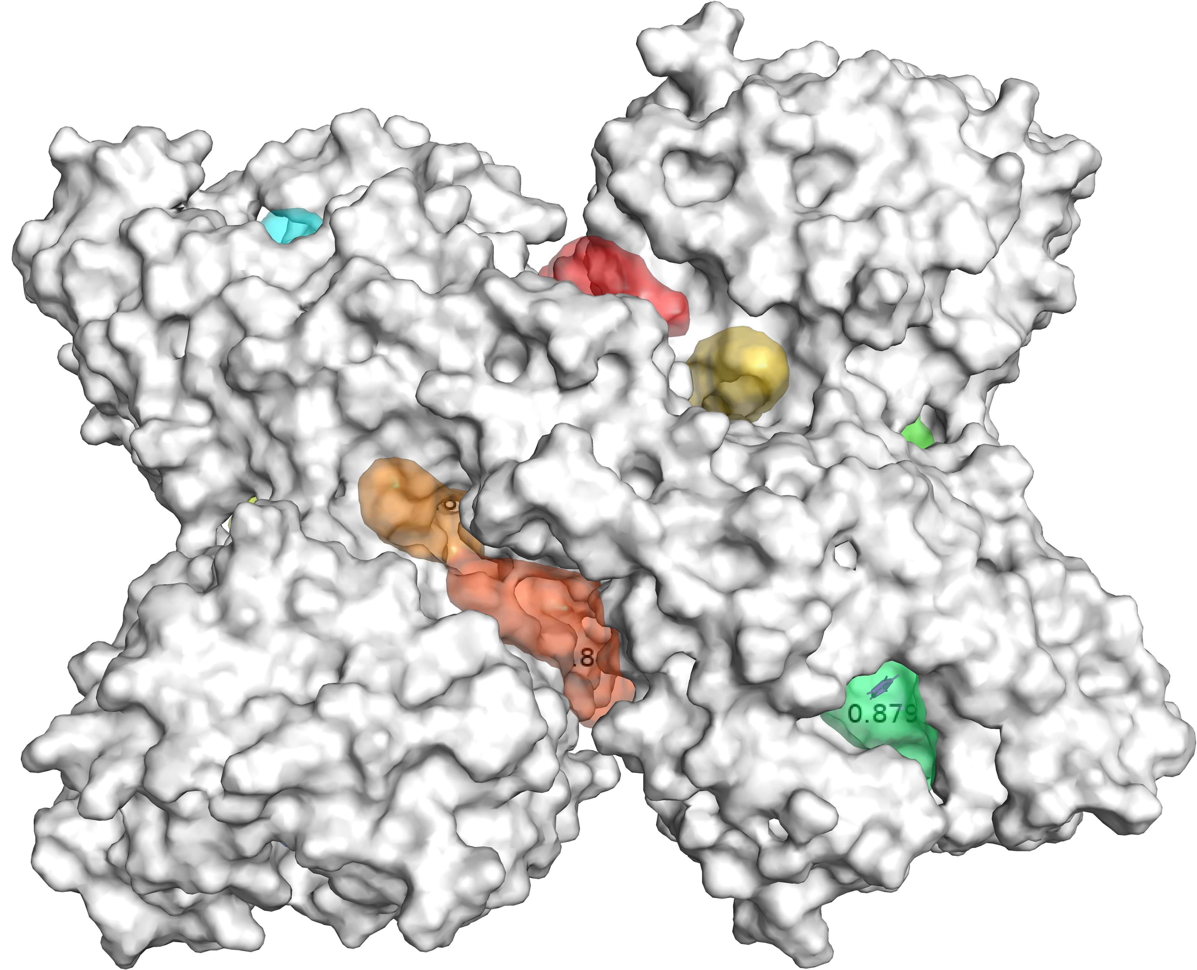Figure 2 displays an example of results of GENEOnet applied to the protein 2QWE. The picture shows a relevant aspect of GENEOnet: the depicted protein is made up of four symmetrical units so that the true pocket is replicated four times. GENEOnet correctly outputs, among the others, four symmetrical pockets that receive high scores. This happens thanks to equivariance, because the results of the model on identical units are the same, with position and orientation coherently adjusted.