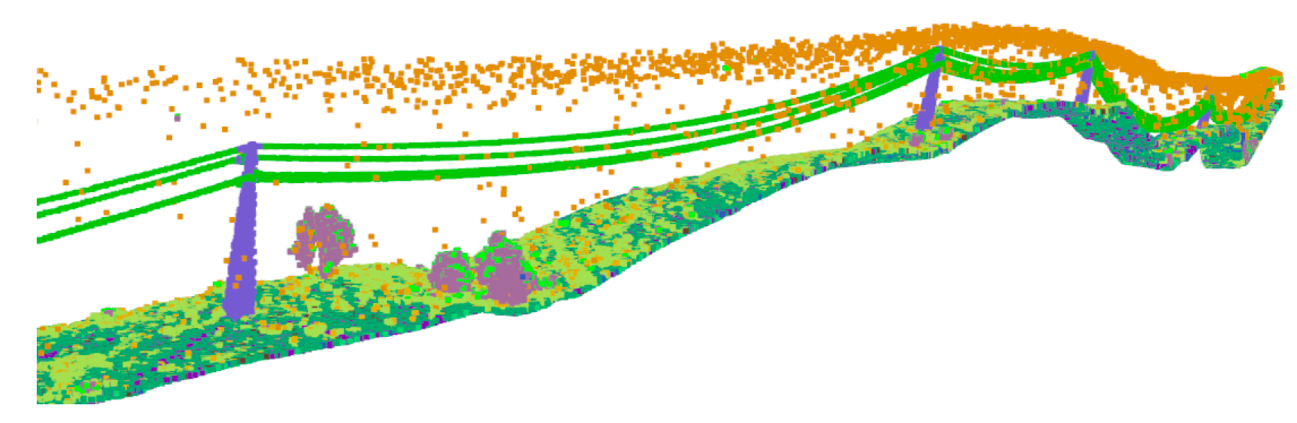 We considered a dataset provided by EDP, using km of rural and forest terrain labelled with 22 classes, culminating in 2823 samples describing the transmission system, named TS40K (see Figure 4). Withal, the provided point clouds exhibit noisy labels and are mainly composed of non-relevant classes for our problem, such as the ground. Power-line supporting towers make up less than 1% of the overall point clouds, which makes noisy labelling a major issue for the segmentation task. For instance, patches of ground incorrectly classified as tower amount to roughly 40% of tower 3D points.