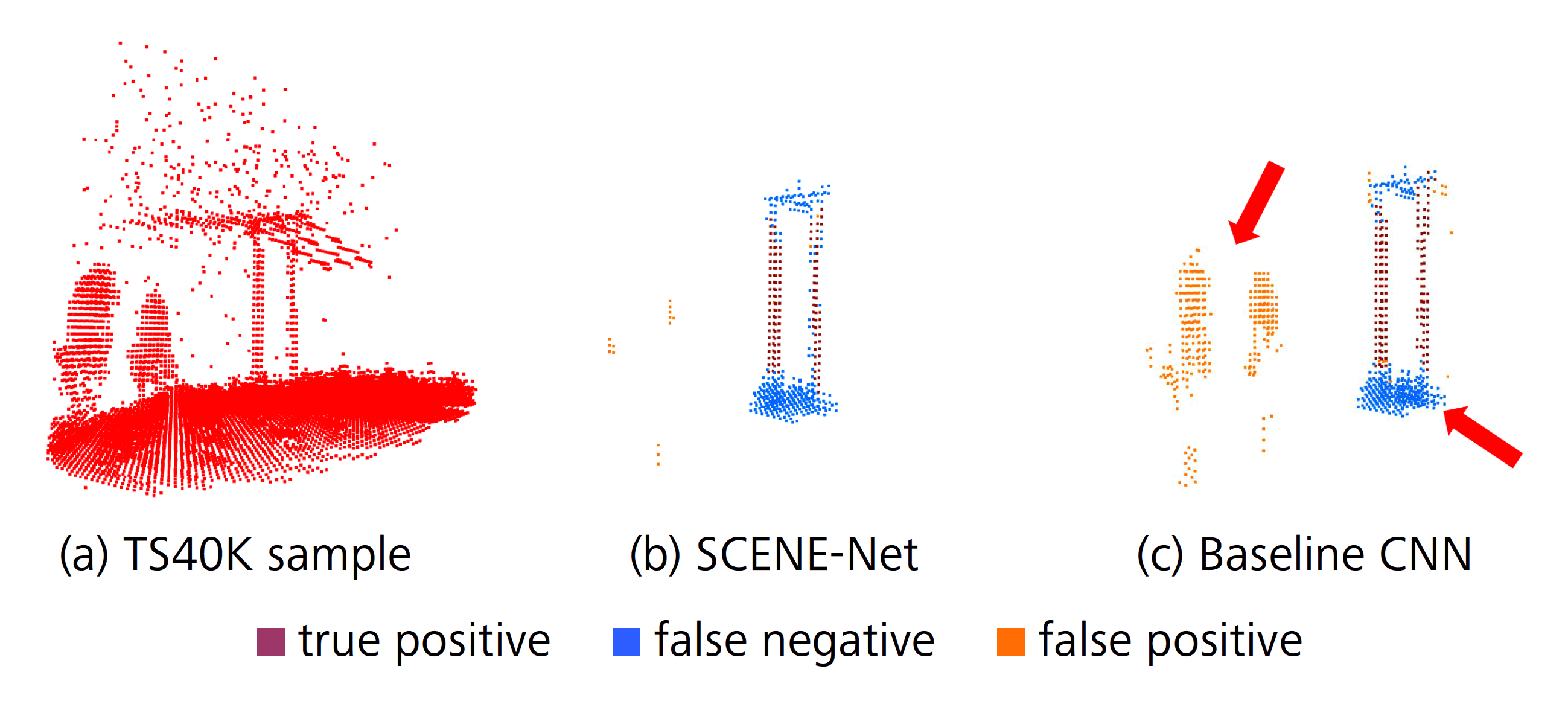 Quantitatively, using SCENE-net we observe a lift in Precision of 24%, and of 5% in IoU, and a drop of 10% in Recall. The lower Recall of SCENE-Net is due to noisy labels in the ground truth. As shown in Figure 6, the ground surrounding supporting towers as well as power lines are often mislabeled as tower.