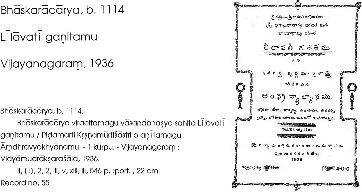 In the 12th century CE, Bhaskara described in his famous book Bijaganita the rules of algebraic operations on positive, negative signs, rules of zero (shunya), and infinity (anantam). His book also shows how to obtain solutions to intermediate equations of the first degree [14 K. Ramasubramanian, T. Hayashi and C. Montelle, (eds.), Bhāskara-prabhā. Sources Stud. Hist. Math. Phys. Sci., Springer, Singapore (2019) ]. Bhaskara’s book titled Siddhanta siromani provided a detailed account of Indian astronomy and its development. Computations of the planetary movements, shapes of planets, rotation axis, lunar month days, etc., were explained in detail. See Figure 2. Pavuluri Mallana translated Mahavira’s Ganitasarasamgraha from Sanskrit in the 11th century to another ancient indian language, Telugu; Joseph [11 G. G. Joseph, Indian mathematics: Engaging with the world from ancient to modern times. World Scientific Publishing, Hackensack, NJ (2016) ] thinks that this stood as a role model for other subsequent translations. Bhaskara’s Lilavati Ganitam was for the first time translated from Sanskrit to Telugu in the 12th century by Eluganti Peddana [4 P. Chenchiah and R. M. Bhujanga, A history of Telugu literature. The Association Press, Calcutta; Oxford University Press, London (1928) ], and into English first in 1816 by John Taylor, then in 1817 by Henry Thomas Holbrooke, who was considered as the first European Sanskrit scholar.