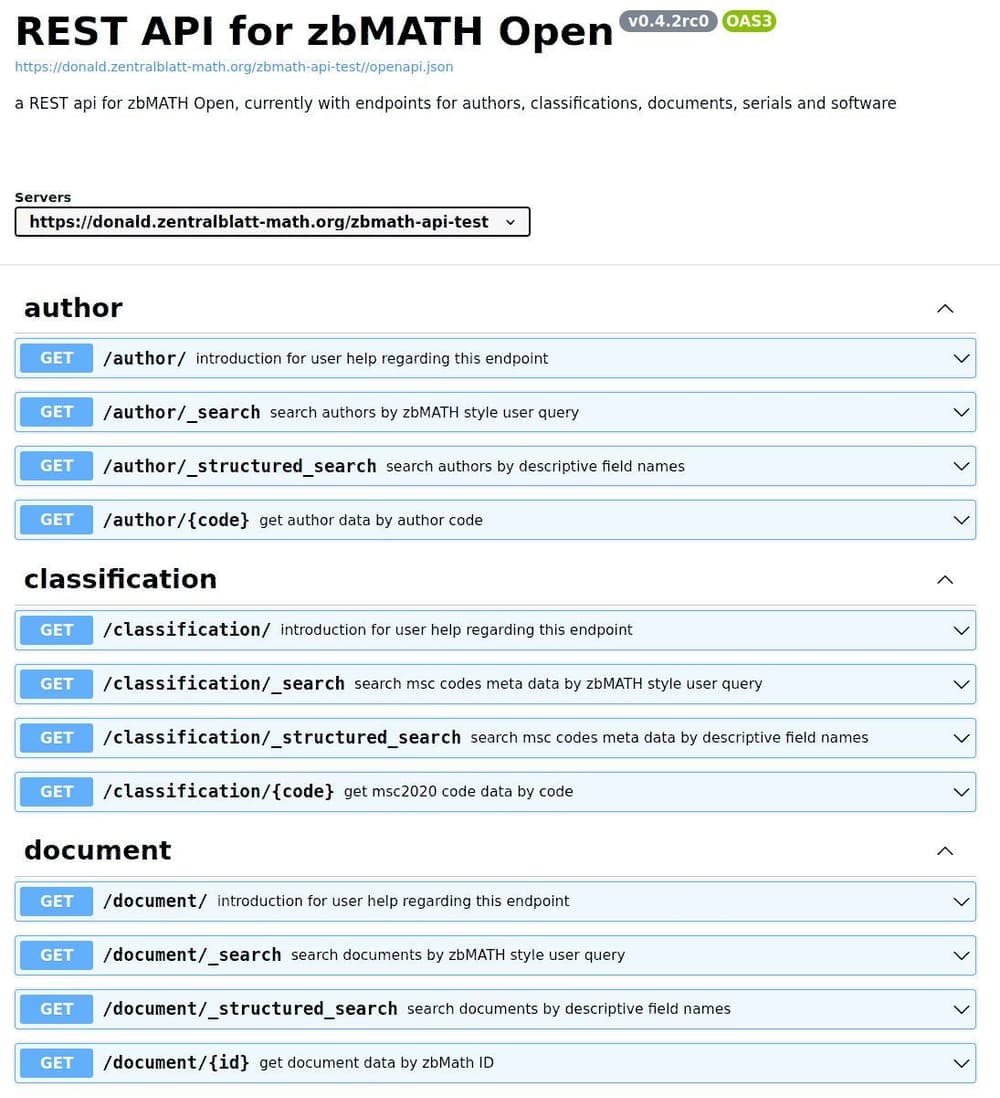 To summarize, the new zbMATH Open REST API will be a useful tool for automated access to the data stored within the zbMATH Open database. It will extend the possibilities currently offered by the OAI-PMH API (without superseding it). With the oncoming features of adding and/or updating information to the database in an automatable way, open access for zbMATH Open data will continue to expand.