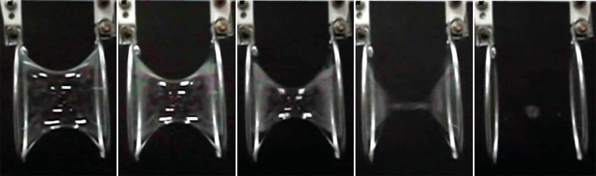 Consider a soap film between two parallel circles of diameter 1, at small distance. We obtain a catenoid as in the left picture of Figure 1. When the separation (distance) between the two circles is small, the catenoid is an area minimizing surface. However, as we separate the circles more and more, we will reach a first critical separation, after which the area of the catenoid will be greater than . Now the catenoidal soap films are no longer minimizers of the area (two flat disks joined with a thin neck would outperform them) but this does not cause any instability. Then, if we continue separating the circles, we reach a second critical separation, after which the soap film breaks into two disconnected disks, as shown in Figure 1.