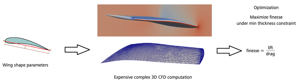 Consider an operator that represents a complex numerical problem or an expensive experiment. Industrial design processes often require frequent evaluations of such operators in many-query tasks, such as parametric exploration, optimization, uncertainty quantification, or calibration. These tasks are intractable without modifications or simplifications, making them unsuitable for real-life industrial applications. For instance, optimizing the shape of an aircraft wing to maximize finesse under a minimum thickness constraint involves many iterations of running a complex fluid solver, which is computationally intensive, see Figure 1.
