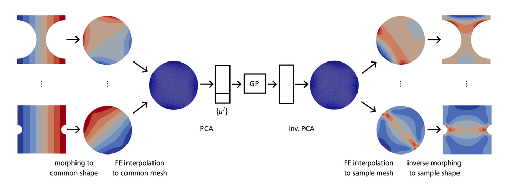 Similarly, a field embedding process is needed to convert variable-sized output fields into learnable objects. We apply the same transformations used for coordinate fields: morphing onto a common shape, finite interpolation onto a common mesh, and PCA compression. This process results in low-dimensional vectors representing our output fields of interest.