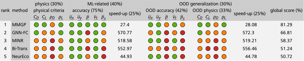 The competition score, ranging from 0 to 100, evaluates both the speed and accuracy of the surrogate model, including scalar quantities derived from the output fields (such as lift and drag coefficients) and their Spearman’s rank correlation coefficients, tested on two test sets, one of them being out-of-distribution. Table 1 shows that our method won first place, outperforming competitors who used advanced deep learning techniques, despite our approach using simpler and more classical tools.
