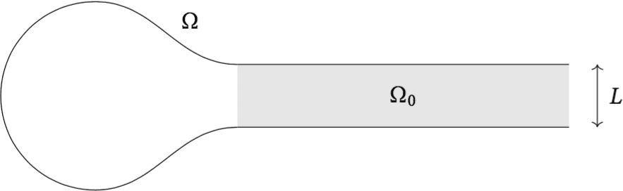 We assume that the round portion is sufficiently large that . Then, by Theorem 1, we know that (6) admits at least one solution. We can show that . Thus Theorem 3 applies when . The critical case is not covered by our result. Nonetheless, in [6 H. Berestycki and C. Graham, The steady states of strong-KPP reactions in general domains, in preparation (2022) ], we exploit the explicit structure of to prove that the solution of (6) is still unique in this case. This supports Conjecture 2.