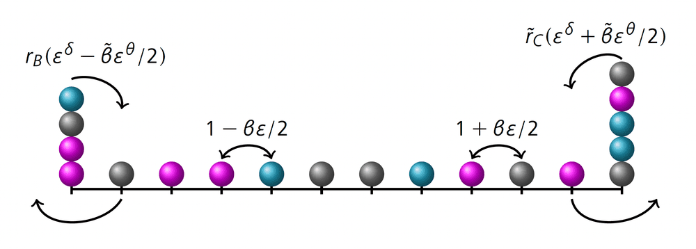 and adding at the boundary points and a dynamics that injects particles (at rate and at the left and right reservoir respectively) or removes particles (at rate and at the left and right reservoir respectively) in the system.