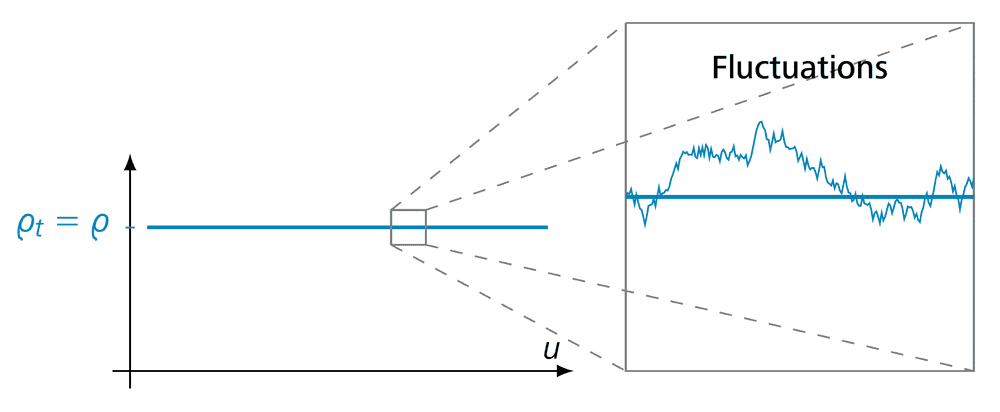 In the last section, we analyzed a Law of Large Numbers for the empirical measure in SIPS with one or more conservation laws. The limit considered in the hydrodynamic limit is deterministic, and we know what is the typical profile that we should observe at any time . The question that we can address now is related to the corresponding Central Limit Theorem, i.e., providing a description of the fluctuations around the hydrodynamic limit. Typically, the study of non-equilibrium fluctuations is very intricate since it requires deep knowledge about the correlations of variables, and this can be quite challenging for the majority of the dynamics. What one is searching for, in the equilibrium scenario in e.g., exclusion processes, is the fluctuations around the constant hydrodynamical profile; see Figure 6.