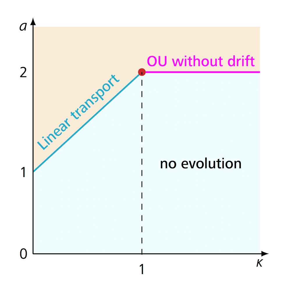 In Figure 8, the light-blue line corresponds to , while the purple line in Figure 9, where we see the Lévy process with exponent , corresponds to . Note that this diagram is complete, but the method that was employed to derive these results relies heavily on the specific form of the dynamics.