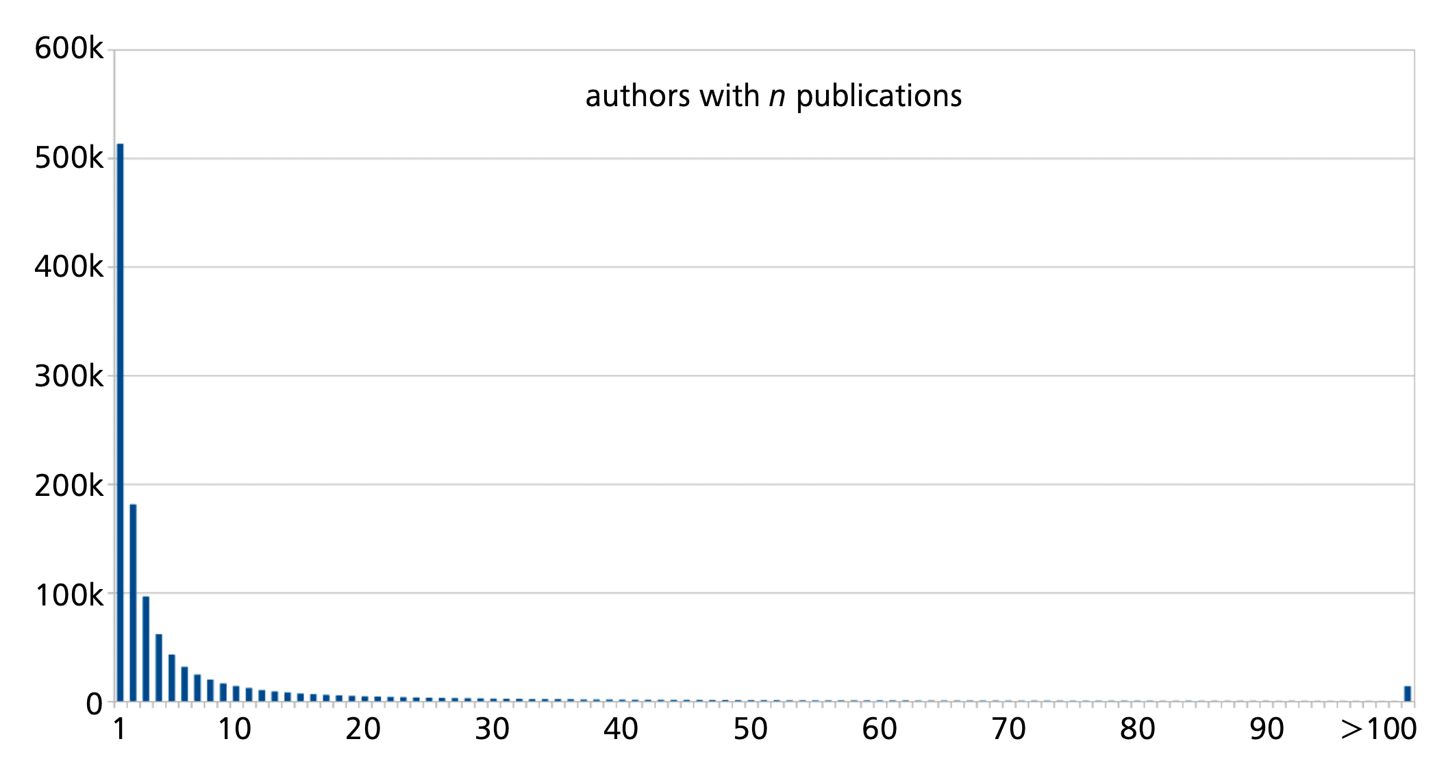 When one focuses on author counts, instead of publication numbers, one has to keep in mind that the distribution of papers is extremely biased. As shown in Figure 1, about 44% of the authors indexed in zbMATH Open are connected with just one publication. The median author has 2 publications, while the average publication number is about 7.9, with the highest number of publications for a single author being 1769.
