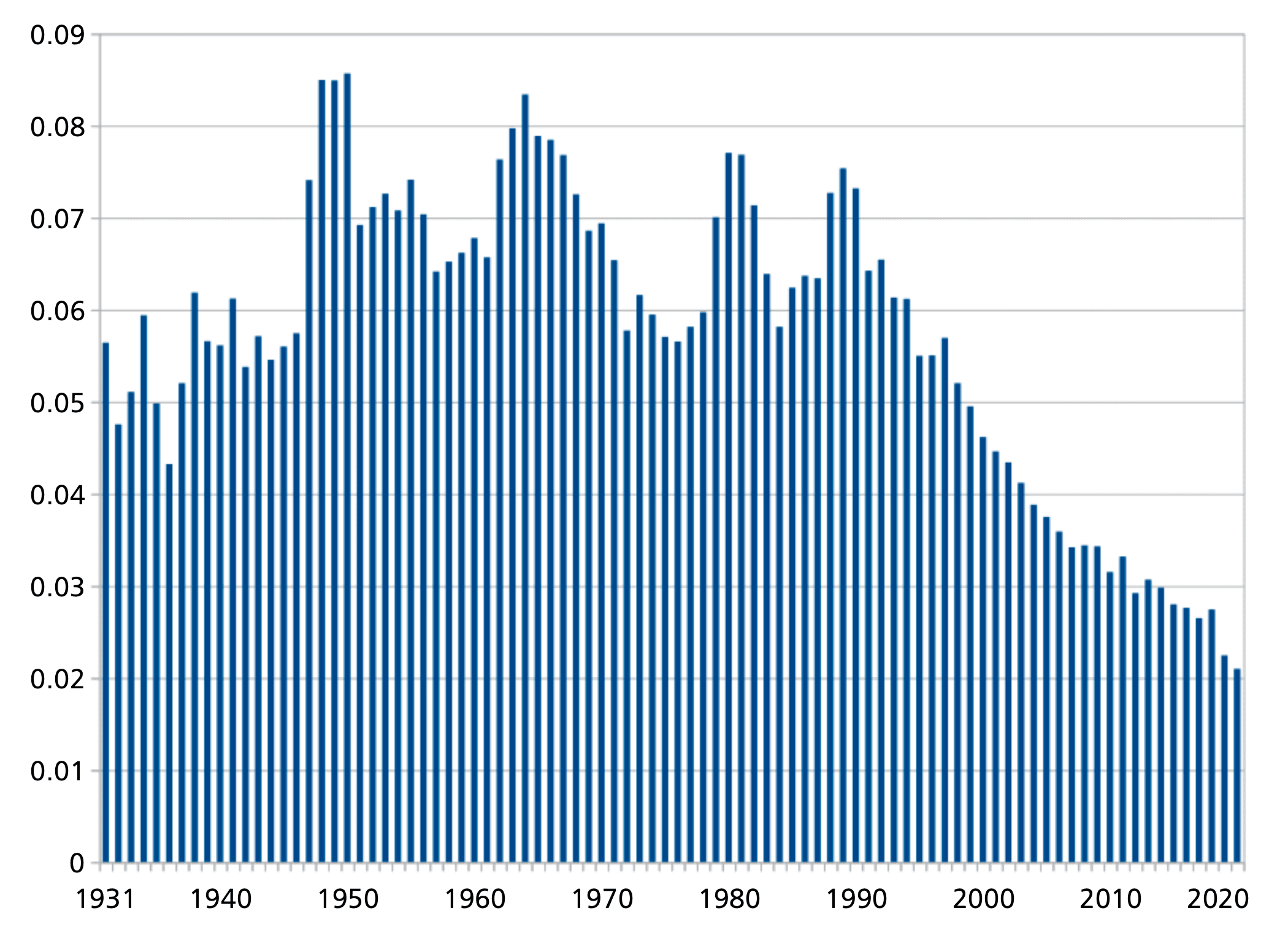 The overall length of publications has actually been decreasing. But this phenomenon is due to the shrinking role of books as shown in Figure 3. Papers in journals have in fact become longer, at least in some areas [5 E. Dunne, Are math papers getting longer? Web blog post in Beyond Reviews: Inside MathSciNet, American Mathematical Society (14 October 2021) https://blogs.ams.org/beyondreviews/2021/10/14/are-math-papers-getting-longer/]. Further effects here come from the replacement of printed by fully electronic versions and from different journal policies. Again, this makes a more detailed analysis, which would also need to involve the journal status, as well as the area, quite demanding and thus be beyond the scope of this short note. In other sciences a tendency to split results into smallest publishable units has been reported. At this stage our data do not allow us to draw substantiated conclusions on this for mathematics.