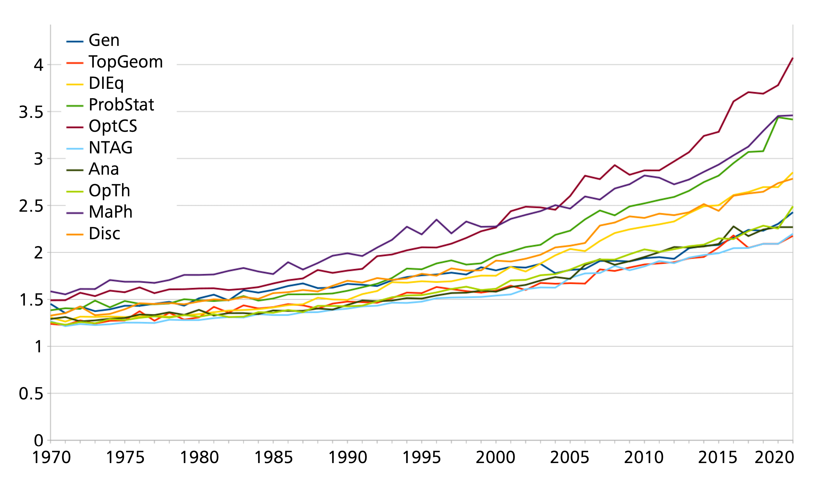 We will, however, see that the changing collaboration behaviour is likely to be a major factor in the increased growth of the number of authors. Historically, mathematical publications were predominantly single-authored. Recently, this has changed significantly, following similar trends in other sciences. Though the overall effect is strongly driven by application areas, the phenomena are visible throughout mathematics. For a subject-specific analysis, we employ the following distribution into mathematical subdomains, as employed in [10 H. Mihaljević-Brandt and O. Teschke, Journal profiles and beyond: What makes a mathematics journal “general”? Eur. Math. Soc. Newsl. 91, 55–56 (2014) , 11 N. Schappacher, Framing global mathematics: The International Mathematical Union between theorems and politics. Springer, Cham (2022) ]: