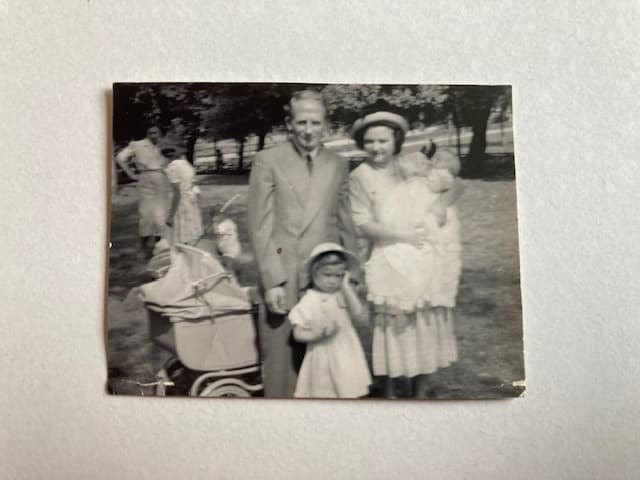 Elisabetta Strickland standing in Rome 1952 with her father Reginald Charles Strickland and her mother Esperia holding her baby sister Sara.