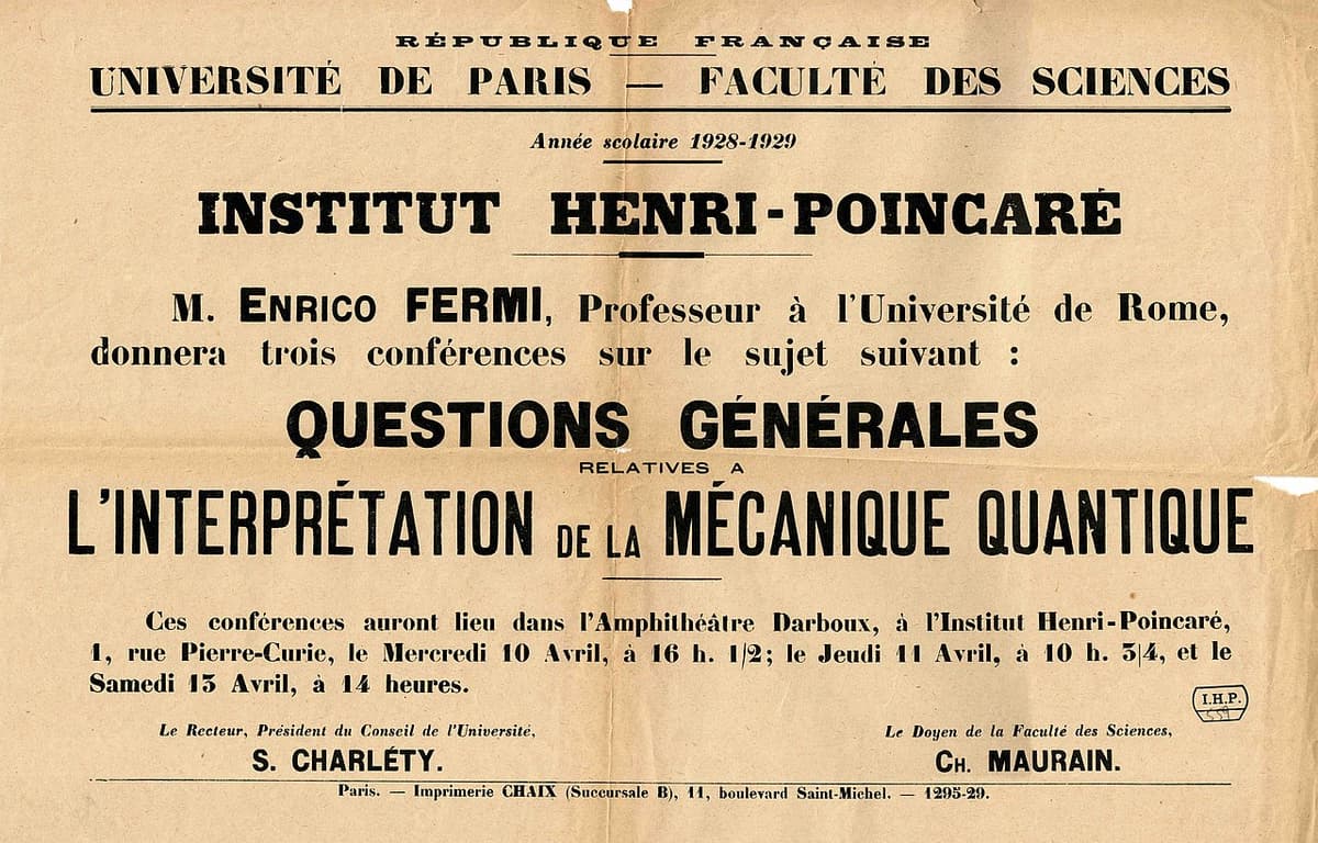 In the interwar period, Borel and his assistant Jeanne Fournier, born Ferrier – who held a Ph.D. in mathematics and was appointed as assistant in calculus of probability but actually worked as a secretary – invited to IHP the greatest specialists of the time in analysis, probability, and mathematical physics: Léon Bloch, George Birkhoff, Max Born, Marcel Brillouin, Francesco P. Cantelli, Torsten Carleman, Charles G. Darwin, Paul Dirac, Théophile de Donder, Albert Einstein, Enrico Fermi (Figure 2), Vladimir A. Kostitzine, Paul Lévy, George Pólya, Erwin Schrödinger, Vito Volterra, etc., from whom we can read lectures in the Annales de l’Institut Henri Poincaré.2https://www.ihp.fr/en/library/annals