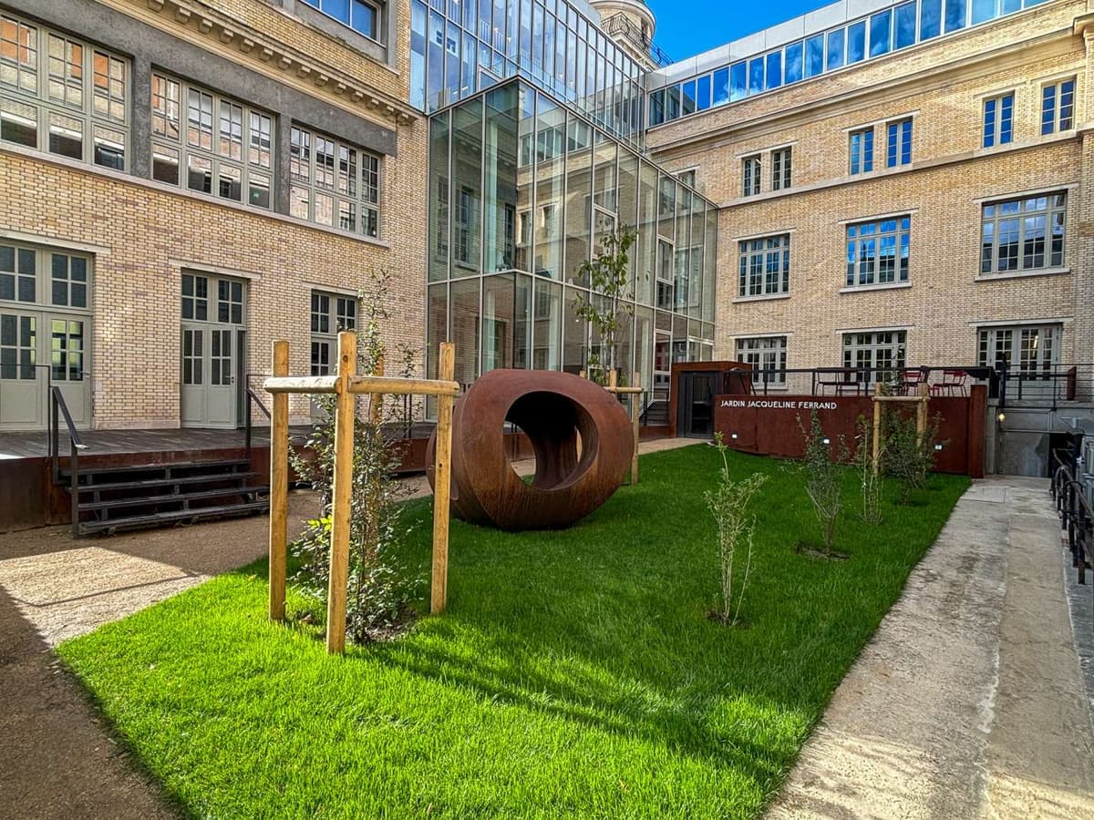 Speaking of art and science, I have to mention the Rulpidon. This is the name given by the French artist Ulysse Lacoste to a series of metal art pieces. He had handed me a small, bronze version of it as a gift to IHP in 2019 – this is now displayed in an optical theatre in the entrance hall of the building. I was instantly fascinated by the Rulpidon, and in turn found several mathematical stories to tell about it [1 S. Benzoni-Gavage, Le Rulpidon sous toutes ses coutures. Dunod, Malakoff, France (2024) ]. We ended up choosing it as the symbol of the Maison Poincaré: In addition to the mathematical stories, the Rulpidon fits very well with the logo. A monumental, steel version of it (Figure 13) was later commissioned by the IHP Endowment fund and installed in the garden.