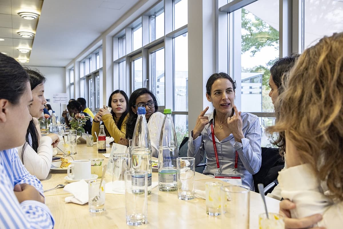 Yael Kalai (2022 ACM Prize in Computing) in discussion with young researchers over lunch at the 11th HLF, 2024.