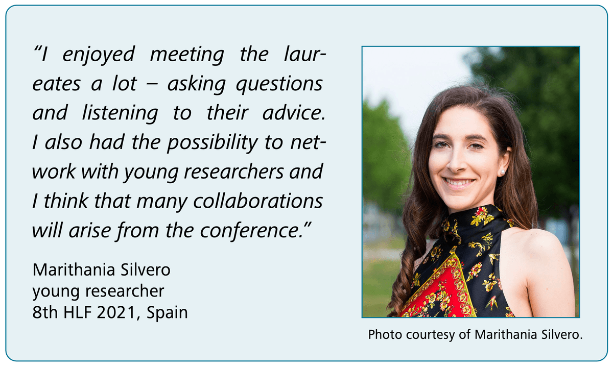 The excitement among the young researchers each year is palpable. Laureate lectures and panel discussions themselves present rare opportunities; but being able to present lightning talks and posters to this eminent audience, and to have informal chats or even a little dance with a laureate, goes far beyond what most will have experienced in their academic life so far. And it creates a lasting impact. “There is a certain exposure to scientific ideas, topics, and discussions, which has an influence on the directions young researchers choose in the future,” says Wienhard.