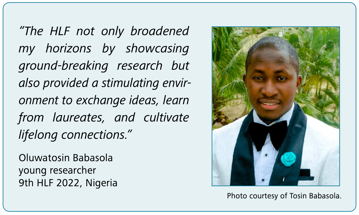 “Our network for young researchers to stay connected after the event is called AlumNode,2https://alumnode.org a cooperation with the Klaus Tschira Stiftung and the German Scholars Organisation,” says Sarah MacLeod, Head of Young Researcher Relations for the HLF. “It is an interdisciplinary alumni network the young researchers can join. They can apply for joint project funding, and we offer them workshops, peer mentoring, and regular gatherings. We also have the HLFF Spotlight series3https://heidelberg-laureate-forum.org/young-researchers/hlff-spotlight where we highlight the happenings in the lives of our alumni.” Additionally, in 2023 the HLFF Inspiring Minds project4https://heidelberg-laureate-forum.org/young-researchers/alumni/hlff-inspiring-minds was launched, which provides expertise and guidance through an expert mentoring programme and a range of engaging digital formats designed to support alumni in developing their personal career path.