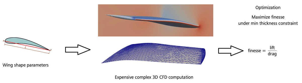 Consider an operator that represents a complex numerical problem or an expensive experiment. Industrial design processes often require frequent evaluations of such operators in many-query tasks, such as parametric exploration, optimization, uncertainty quantification, or calibration. These tasks are intractable without modifications or simplifications, making them unsuitable for real-life industrial applications. For instance, optimizing the shape of an aircraft wing to maximize finesse under a minimum thickness constraint involves many iterations of running a complex fluid solver, which is computationally intensive, see Figure 1.