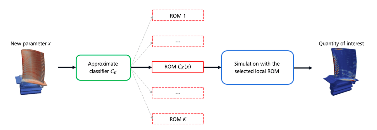 Consider the problem of predicting the lifetime of 3D elastoviscoplastic high-pressure turbine blades, now with the temperature loading field as input. To use a dictionary of local ROMs, we need to know in advance in which cluster of the outputs the solution is located, for us to use the adequate local ROM. To achieve this, we train a classifier to select the correct local ROM based on the 3D input temperature field, similar to how classifiers in computer graphics recognize objects in images, see Figure 3. Such workflows are proposed in [13 T. Daniel, F. Casenave, N. Akkari and D. Ryckelynck, Model order reduction assisted by deep neural networks (ROM-net). Adv. Model. Simul. Eng. Sci. 7, article no. 16 (2020) ]. Unlike image classifiers, our situation involves few high-dimensional inputs. To improve the classifier training, we developed specialized feature selection and data augmentation techniques. This approach ensures accurate local ROM selection and effective handling of complex, high-dimensional input data, see [14 T. Daniel, F. Casenave, N. Akkari and D. Ryckelynck, Data augmentation and feature selection for automatic model recommendation in computational physics. Math. Comput. Appl. 26, article no. 17 (2021) ].