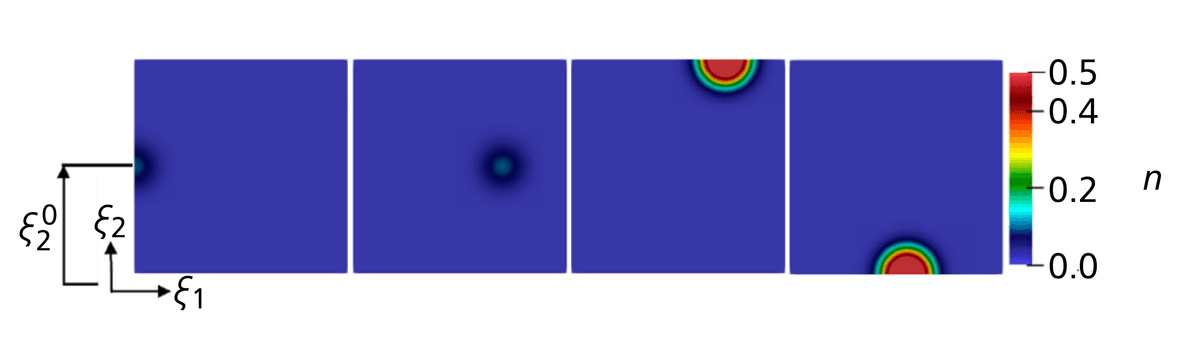 Consider a 2D advection problem where Gaussian processes with small (0.1) and large (1) amplitudes and various vertical positions move from left to right, see Figure 4.