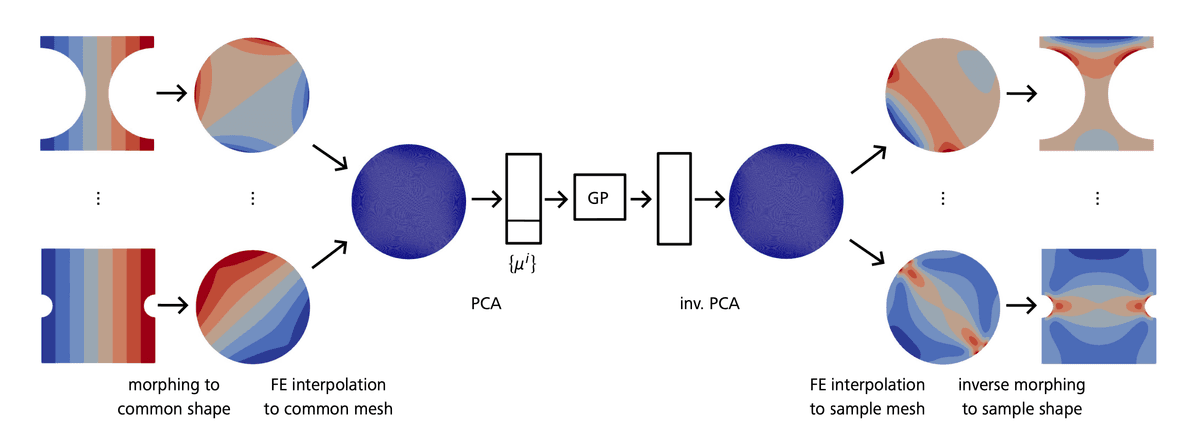 Similarly, a field embedding process is needed to convert variable-sized output fields into learnable objects. We apply the same transformations used for coordinate fields: morphing onto a common shape, finite interpolation onto a common mesh, and PCA compression. This process results in low-dimensional vectors representing our output fields of interest.