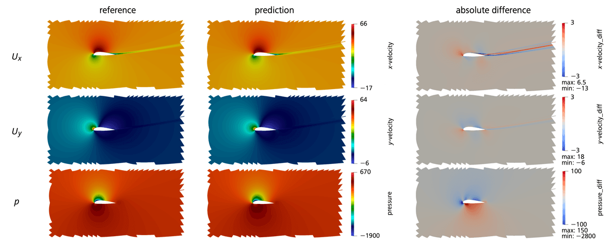 We participated in a competition [16 IRT SystemX et al., ML4PhySim challenge. https://www.codabench.org/competitions/1534, accessed: 2024-08-07 ] organized by IRT SystemX and partners, where we employed our MMGP technology. The challenge involved predicting pressure, velocity, and turbulent viscosity fields on the AirfRANS dataset [1 F. Bonnet, J. Mazari, P. Cinnella and P. Gallinari, Airfrans: High fidelity computational fluid dynamics dataset for approximating Reynolds-averaged Navier–Stokes solutions. Adv. in Neural Inf. Process. Syst. 35, 23463–23478 (2022) ], introduced in Section 1.