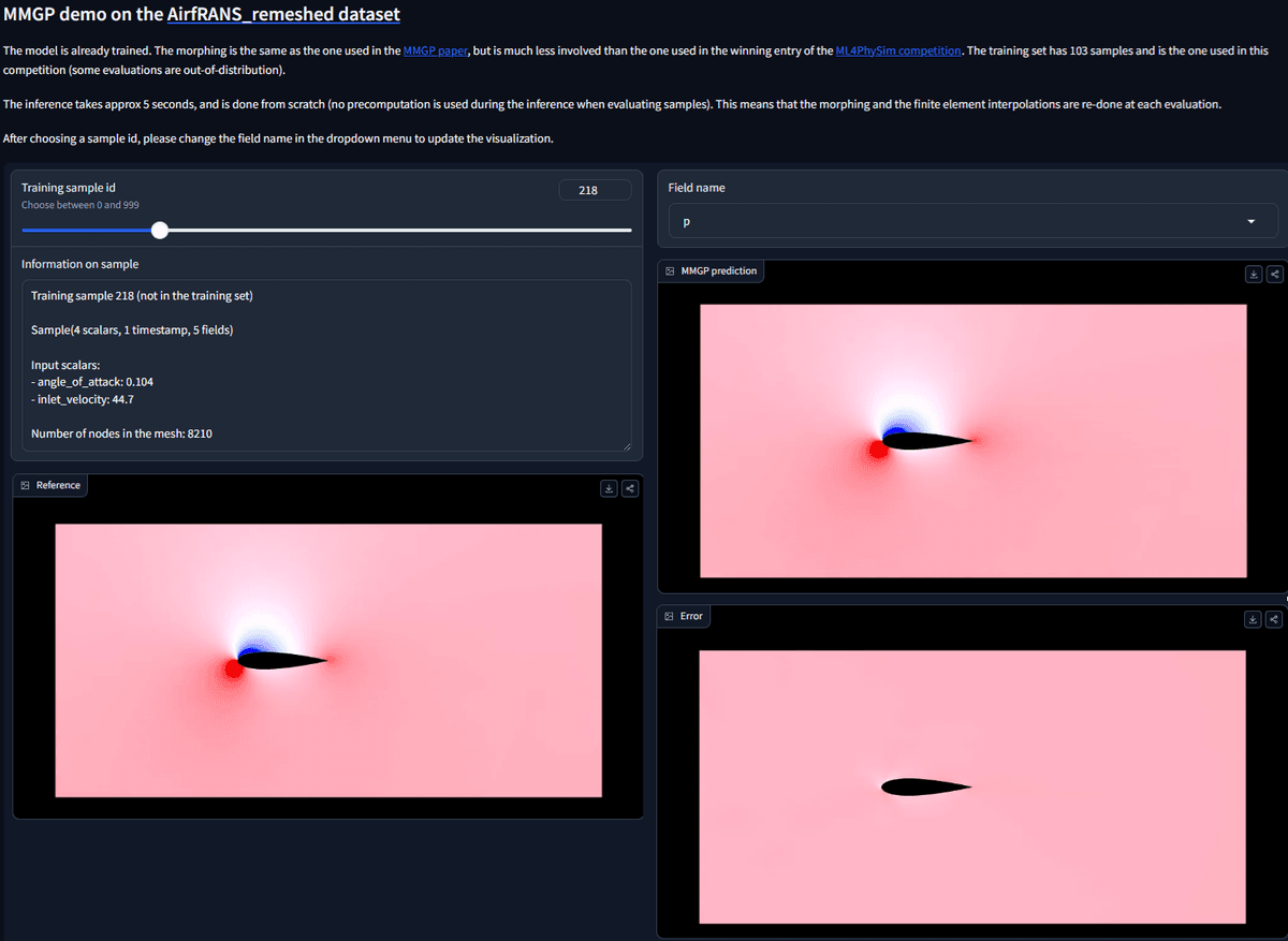 Additionally, we have distributed a demo of our MMGP method on Hugging Face’s Spaces platform, which was applied to the ML4PhySim competition problem presented in Section 3.2, see Figure 9. In this demo, users can select a sample ID, which triggers the MMGP surrogate model, which involves: morphing, finite element interpolation, projection onto snapshot POD modes, inference using a Gaussian process regressor, and finally, inverse snapshot POD and finite element interpolation. Predicted fields, reference data, and errors are plotted. Note that for real-time performance, the demo uses a remeshed dataset with meshes reduced from approximately 180,000 nodes to around 8,000 nodes.