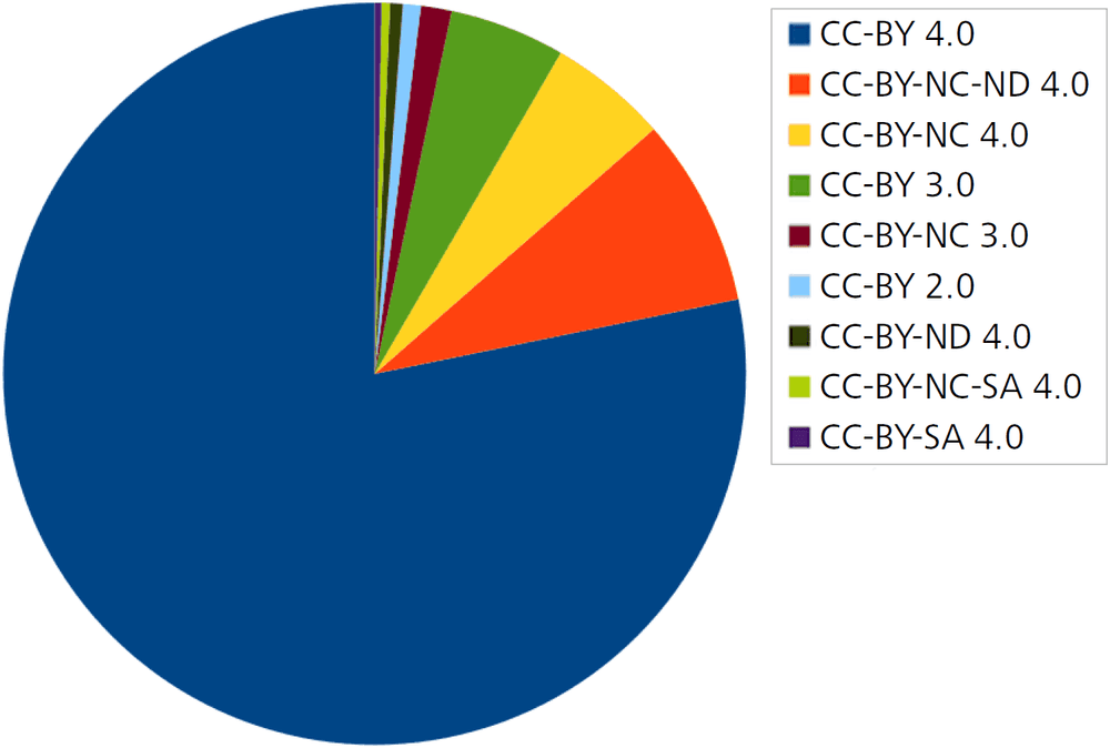 Naturally, these questions have only become important relatively recently, so it is not surprising that only a fraction of the free documents in zbMATH Open come also along with a FAIR licence (e.g., most historical arXiv submissions come with a non-exclusive distribution licences, although also CC licences are now available for some years). Figure 4 shows the current share of various CC licence information collected for documents in zbMATH Open from various sources (publishers, platforms, OpenAlex…), but are currently available for only about 5% of the entries.
