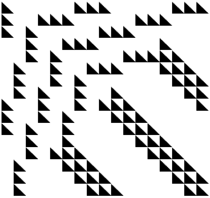 We realize immediately that the very simple process we have implemented quickly produces complex, unpredictable patterns, even though they are determined by the sequence chosen at the outset and, in particular, are highly dependent on its length. For example, it can be seen in Figure 11 that sequences with lengths in multiples of four produce much more regular patterns than the example of length five chosen above, notably because the numbers belonging to any of the pattern’s semi-diagonals are always congruent modulo 4. This means that the same tile can be found all along (resp., at least every other time) a semi-diagonal of a pattern produced by a sequence of length four (resp., eight). It is worth noting that, even in this case, reversing two tiles will produce very different effects.