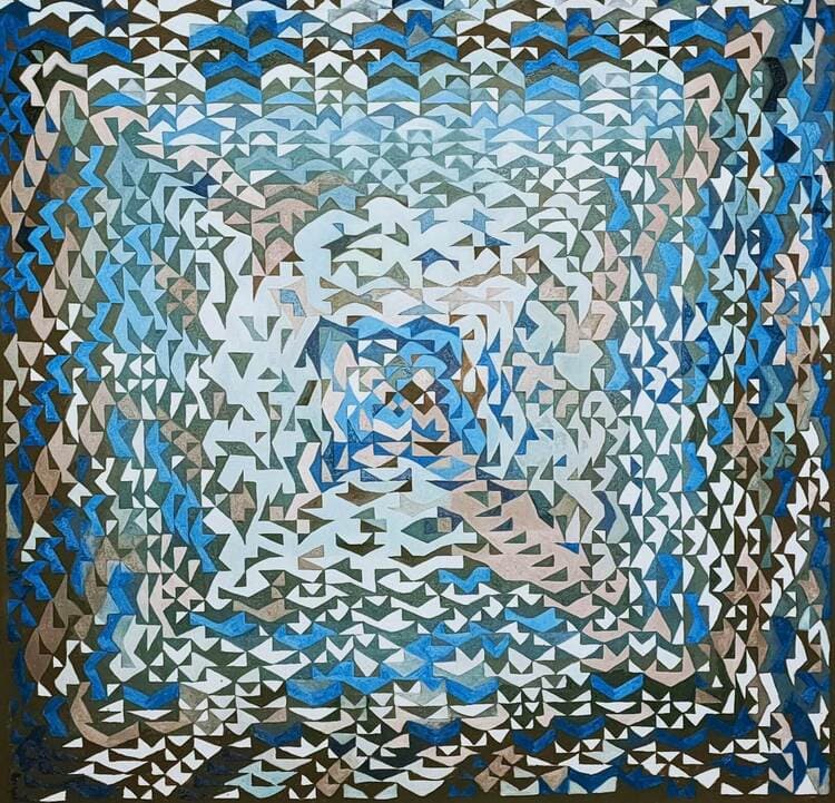 At the origin of the Transitions series, there is … a desire for geometry! Like several other artists before him, Reg Alcorn was looking for a geometric process to structure the canvases of his new series. Among the artists who followed this path, some of them having links to mathematics, are Mondrian (1872–1944), Kandinsky (1866–1944), Vasarely (1906–1997), Morellet (1926–2016) and, of course, Picasso (1881–1973) and the Cubist movement in general, for the analysis of perception and the geometrization of space.