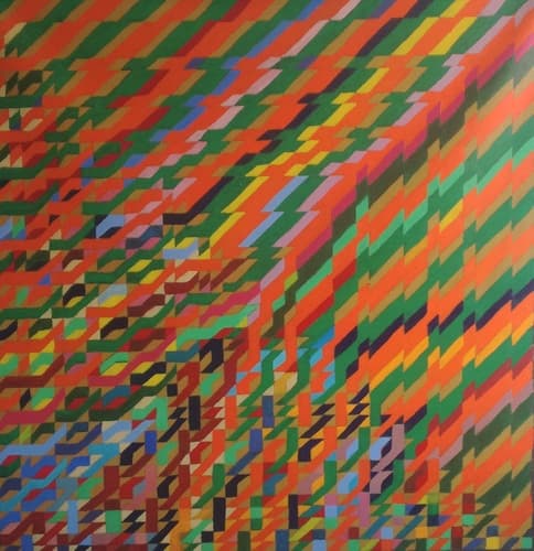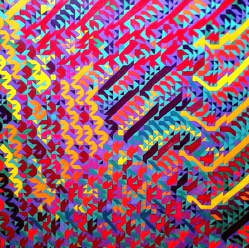 Although the colors are well delineated on the canvas, predicting the effect their juxtaposition will produce in the patterns created by the sequence of Truchet tiles is a challenge that only the artist’s long experience and sense of color can meet. And there are surprising outcomes in certain cases, when the colors “vibrate” in contact with each other, whenever the eye is at the right distance from the canvas. All this is the fruit of long-term research, as he explains: