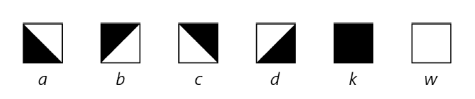 For his series of paintings Transitions, the artist has developed a systematic procedure14Although he might occasionally deviate from it, over the course of the two hundred paintings in this series. determined by the two mathematical ingredients presented above: Truchet tiles and Ulam’s spiral. In fact, to the four tiles obtained by turning the Truchet tile in Figure 2, he adds two: an all-white square and an all-black square. It is convenient to codify them as in Figure 9.