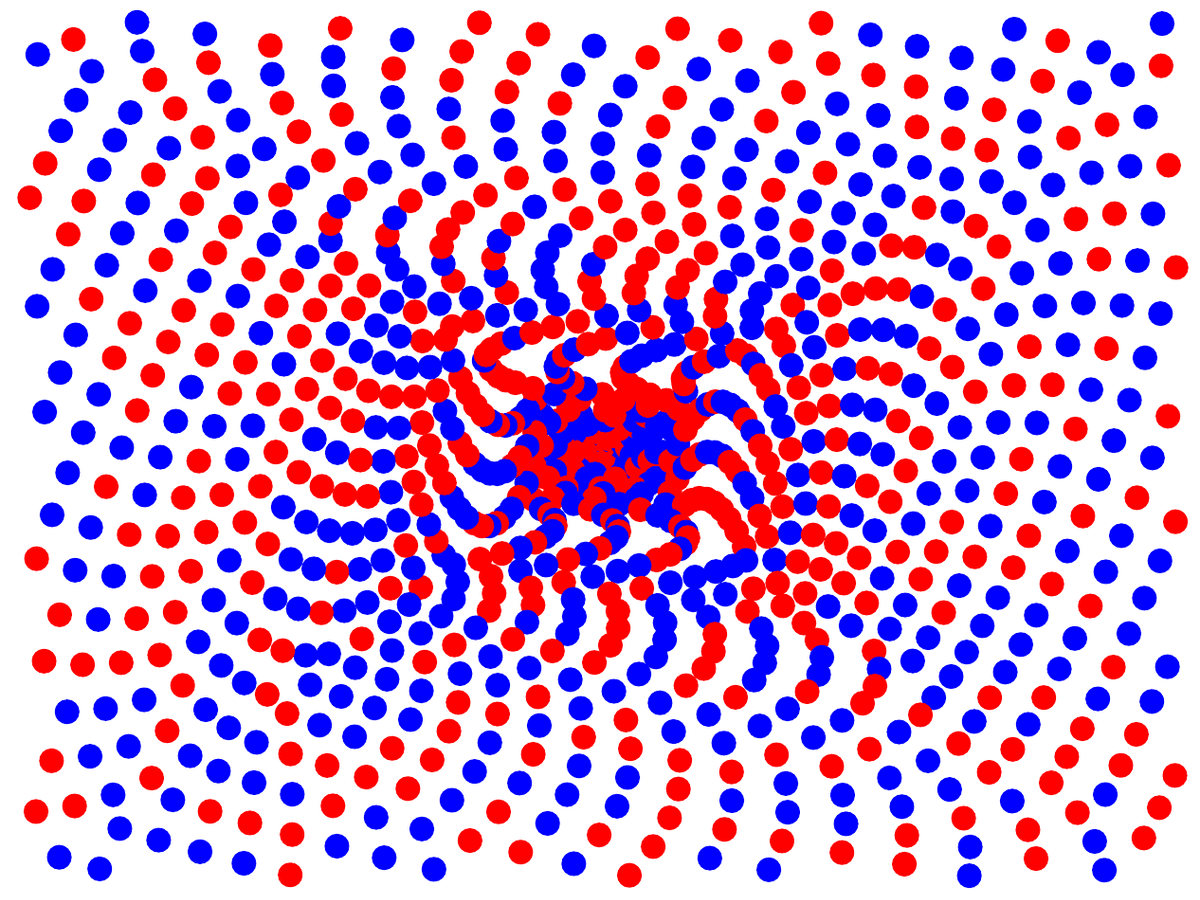 The rule we have described for determining the paintings’ motifs, that is, the choice of a sequence of Truchet tiles wound into a spiral, has also been subject to exceptions, even transgressions, in the course of the very many canvases that have been created. These have often proved to be judicious and enriching in terms of new perspectives. Some paintings, for example, are constructed from several spirals starting from different foci, which can give the impression of a more realistic painting: with five foci, one thinks almost instinctively of the more or less symmetrical five-pointed shapes so familiar in the natural environment, like that of a silhouette with a head, two arms and two legs, somehow blurred by the pictorial process, unless the colors chosen by the painter make it appear.