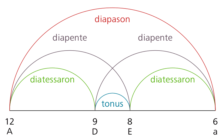 Retrospectively, the theory of proportions in the Pythagorean tradition can be considered a theory for rational numbers greater than one under multiplication1We are aware that the antique ratios are not yet fully fledged rational numbers, i.e., classes of ordered pairs of integers. Whereas ratios were considered equivalent to their representations in lowest terms, the order of the terms of a ratio was not constitutive. The ratios and , for instance, represent the same relationship (the epitriti or sesquitertia) corresponding to the musical interval of the fourth (the diatessaron, see Figure 1) in the sense of a perceptual distance. For our purpose the restriction to rational numbers greater than 1 is sufficient and convenient.. In its application to musical harmonies and scales, adding musical intervals corresponds to the multiplication of rational numbers, and therefore piling equal intervals, i.e., multiplying a given interval by an integer, is equivalent with raising its ratio to the respective integer power2The term musical interval refers to logarithms of frequency ratios. Many quantifiable sensory phenomena and their physical counterparts are in a logarithmic or nearly logarithmic relationship, as loudness or brightness sensation with respect to the intensity of sound or light..